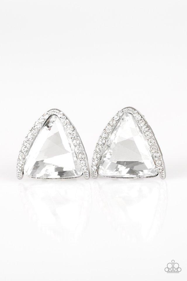 Featuring a regal triangular cut, an oversized white gem is nestled in an angled silver frame radiating with dainty white rhinestones for a glamorous look. Earring attaches to a standard post fitting.
