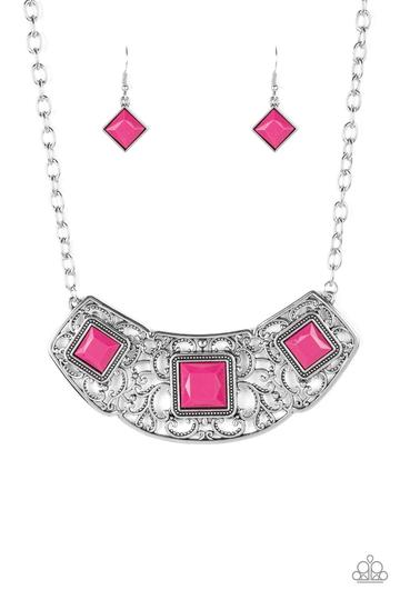Glistening silver filigree spins into a dramatic pendant below the collar. Square pink beads are pressed into the airy frame for a colorful finish. Features an adjustable clasp closure.