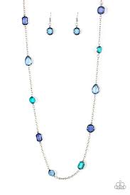 Featuring sleek silver fittings, an array of glassy blue and green gemstones trickle along a shimmery silver chain for a glamorous look. Features an adjustable clasp closure.