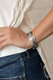 Ringed in glittery black and white rhinestones, hammered silver frames alternate with dainty hammered discs along stretchy bands around the wrist for a refined flair.