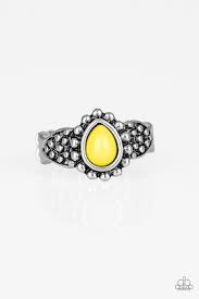 A teardrop yellow bead is pressed into the center of a dainty silver band radiating with studded patterns for a seasonal look. Features a dainty stretchy band for a flexible fit.