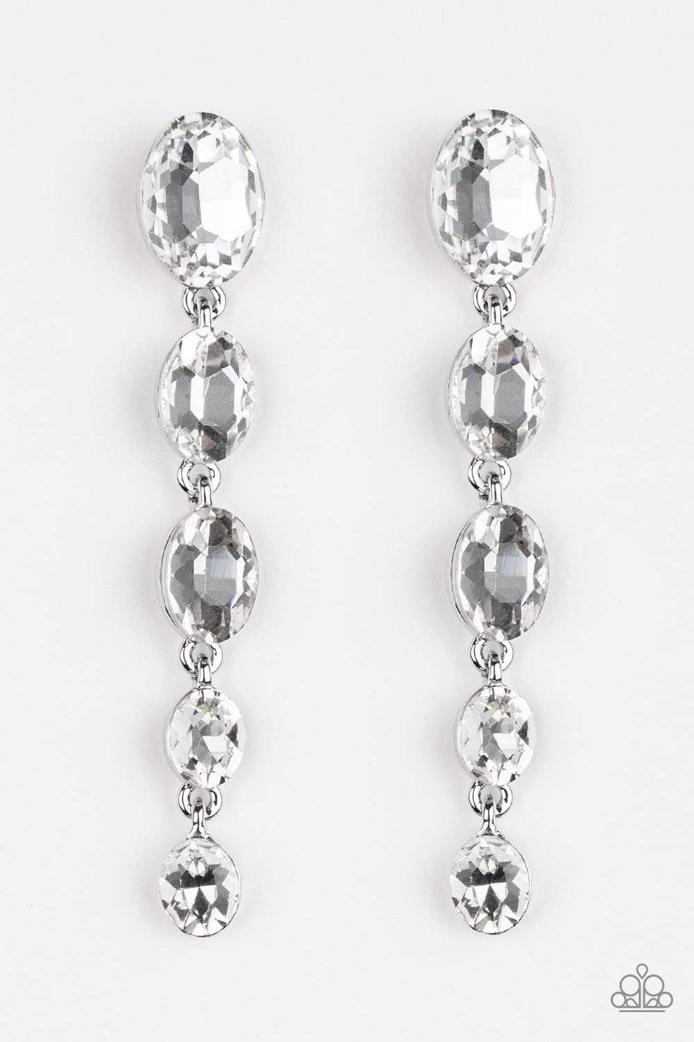 Gradually decreasing in size, glittery white gems trickle from the ear in a glamorous fashion. Earring attaches to a standard post fitting.
