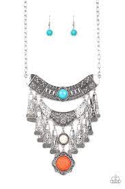 Infused with refreshing stone accents and a collision of hammered, studded, and embossed patterns, two silver half-moon plates dramatically stack below the collar. Swirling with studded filigree detail, ornate silver frames swing from the bottoms of the stacked pendants, creating a fierce tribal inspired fringe. Features an adjustable clasp closure.