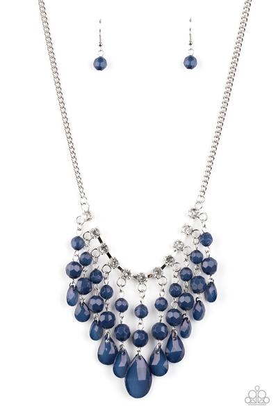 Featuring faceted finishes, blue beaded tassels drip from the bottom of a classic row of glittery white rhinestones. The shimmery blue teardrops gradually increase in size at the center as they taper below the collar, creating a flirtatious fringe. Features an adjustable clasp closure.