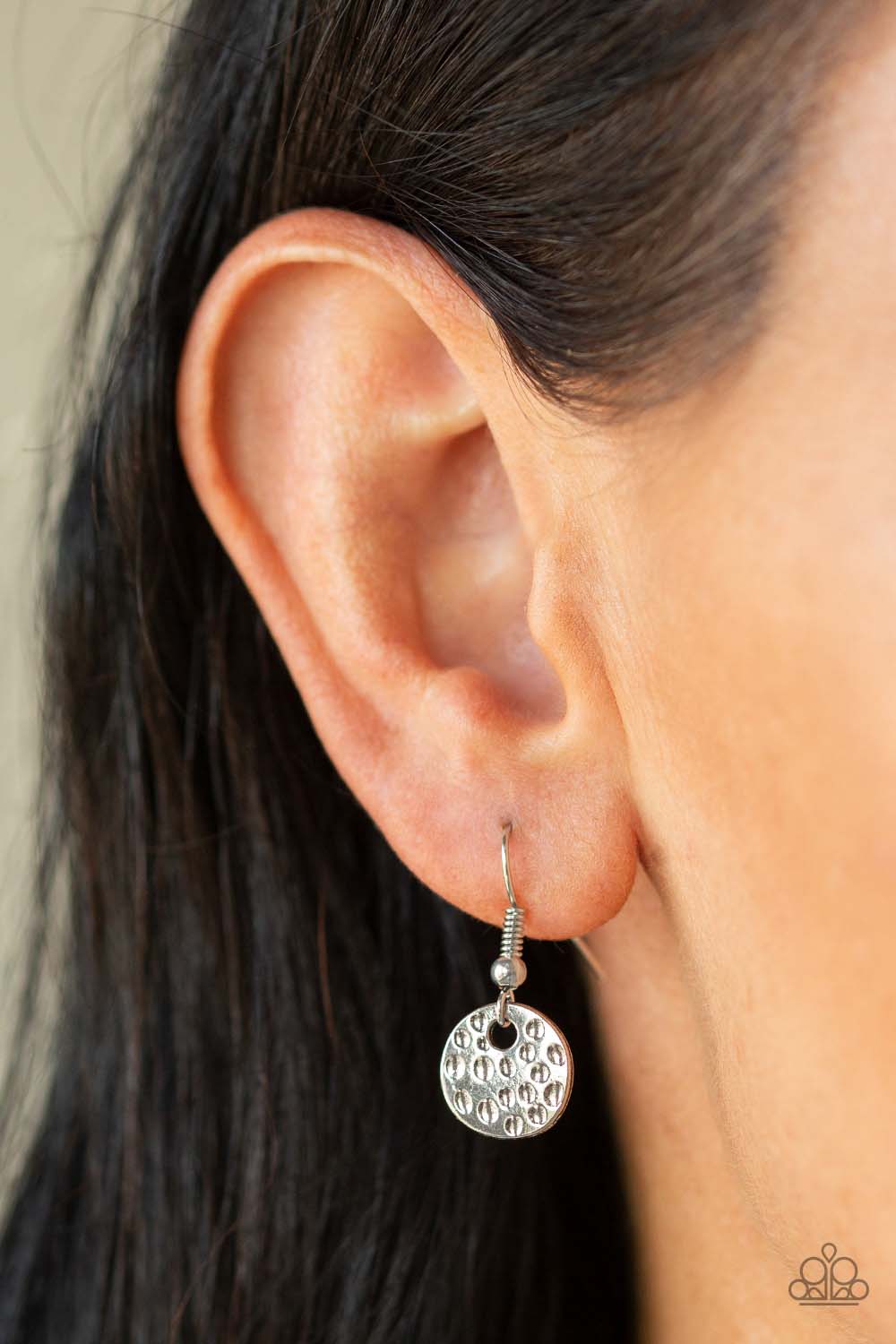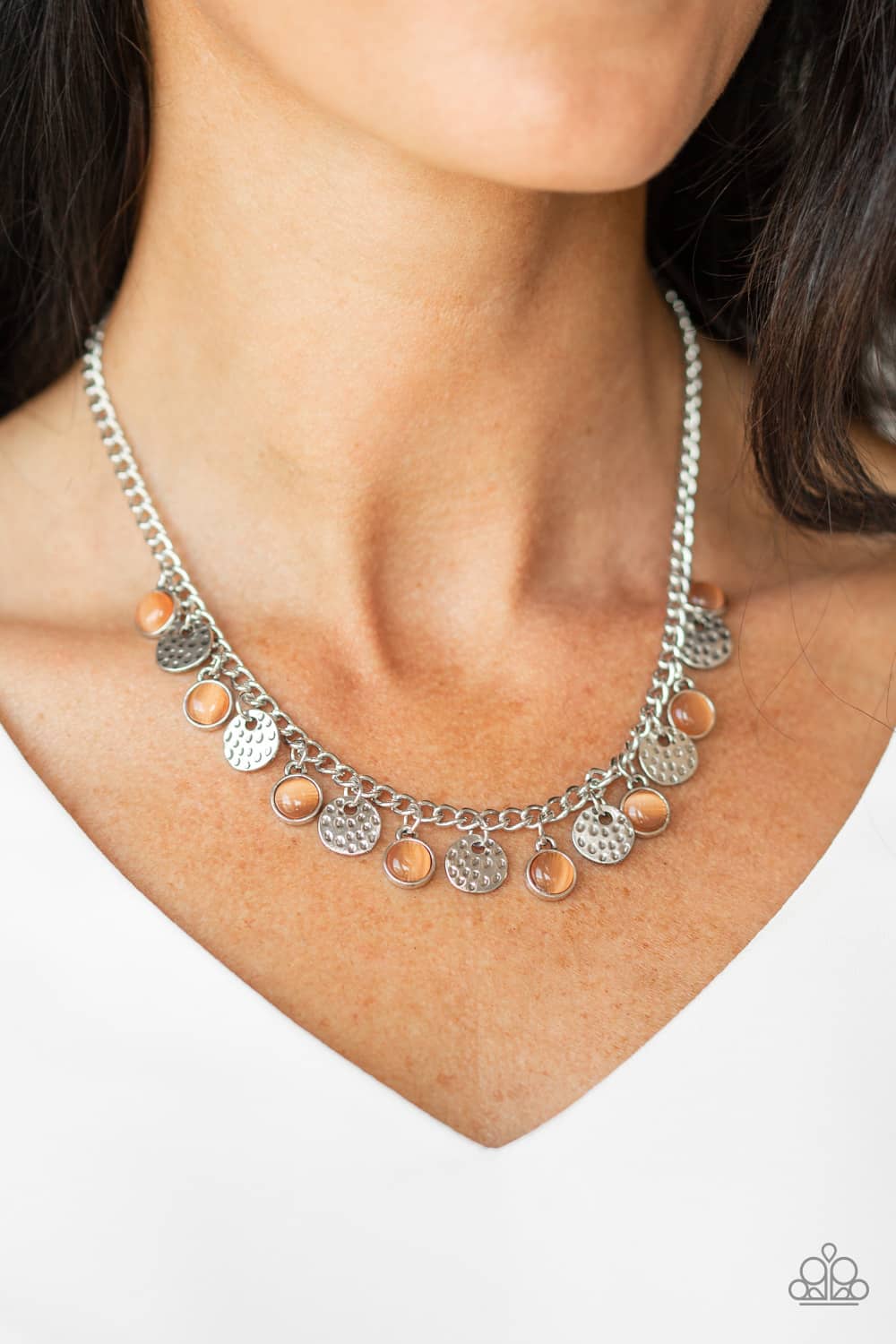 Dainty orange cat’s eye frames and hammered silver discs swing from the bottom of a shimmery silver chain, creating a whimsical fringe below the collar. Features an adjustable clasp closure.