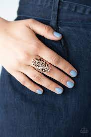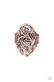 Brushed in an antiqued shimmer, copper vine-like filigree branches across the finger for an airy look. Features a stretchy band for a flexible fit.